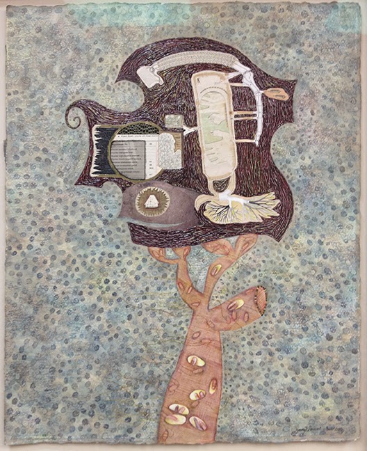 Collage unites the four artists but they work in very different styles. Jenny Honnert Abell's work combines the