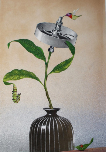 of machines, and anthropomorphic hybrids to conjure up surreal worlds. In her own words: “Collage is a rush for